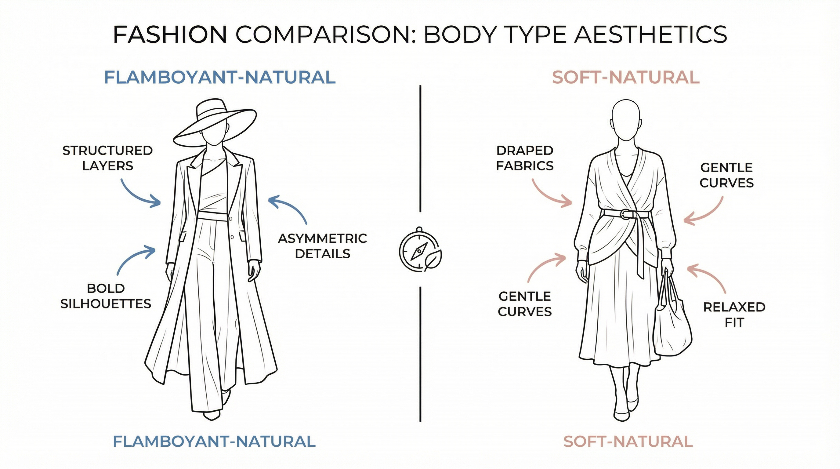 Flamboyant Naturals need long, flowing, unconstructed pieces that honor their vertical line and width. Think maxi lengths, long layers, oversized coats, and pieces that move. The key is length + relaxation without needing curve emphasis. Soft Naturals need relaxed, unconstructed pieces that ALSO accommodate curves. Think flowing but with waist definition, soft fabrics that drape over curves, and moderate lengths that don't overwhelm their shorter vertical line. The key is width accommodation + curve accommodation.