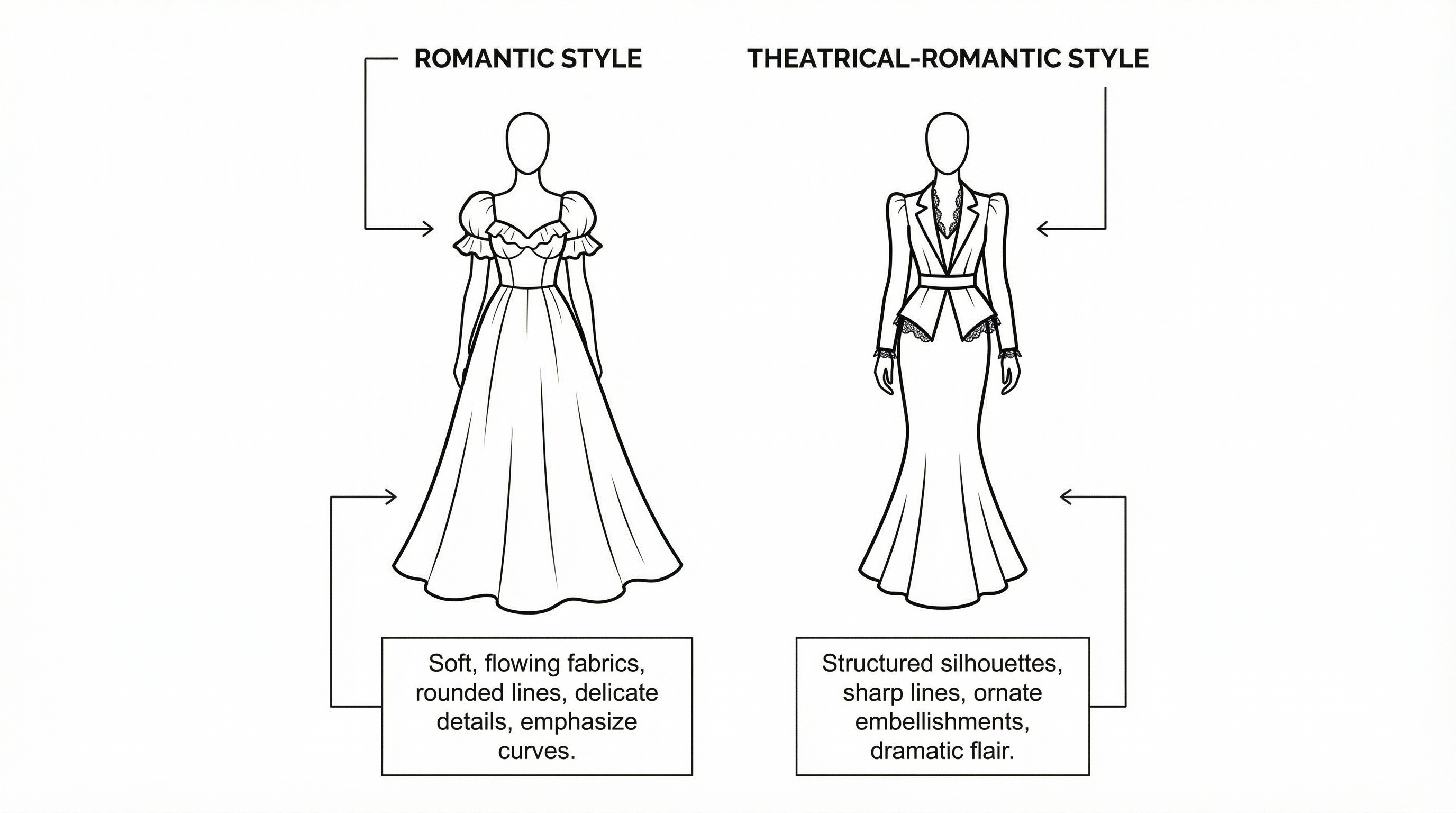 Pure Romantics need soft, gentle, dreamy aesthetics. Think soft florals, delicate lace, rounded shapes, and romantic details without too much boldness. The look should be feminine and sweet rather than dramatic. Avoid heavy ornamentation or overly glamorous pieces that overpower the soft yin. Theatrical Romantics can embrace more drama and glamour. Think bold curves, statement jewelry, luxurious fabrics, and ornate details. The look should be sensual and striking while still honoring the curves. Old Hollywood glamour is the Theatrical Romantic sweet spot.