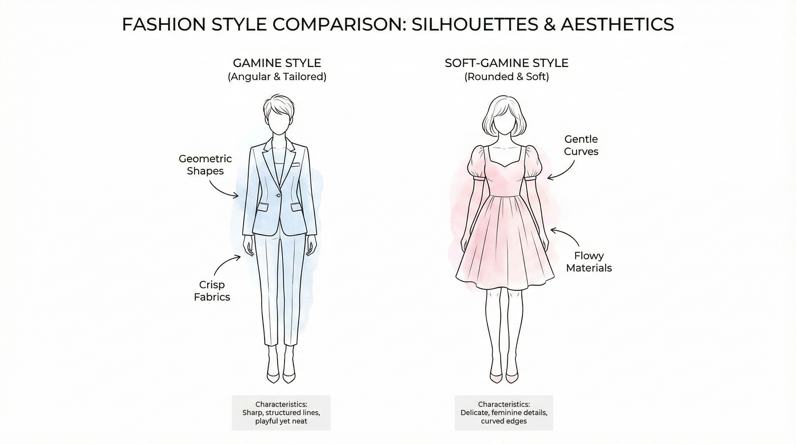 The key difference is the yin-yang balance. Pure Gamine has a more even mix of yin and yang elements—perhaps soft features with sharp bones, or vice versa—creating an intriguing contrast. Soft Gamine leans yin, with soft, rounded features and soft curves over their small frame. The softness is noticeable and dominant. Think of Pure Gamine as "playful contrast" and Soft Gamine as "soft cuteness." Both are youthful and petite, but the overall impression differs.