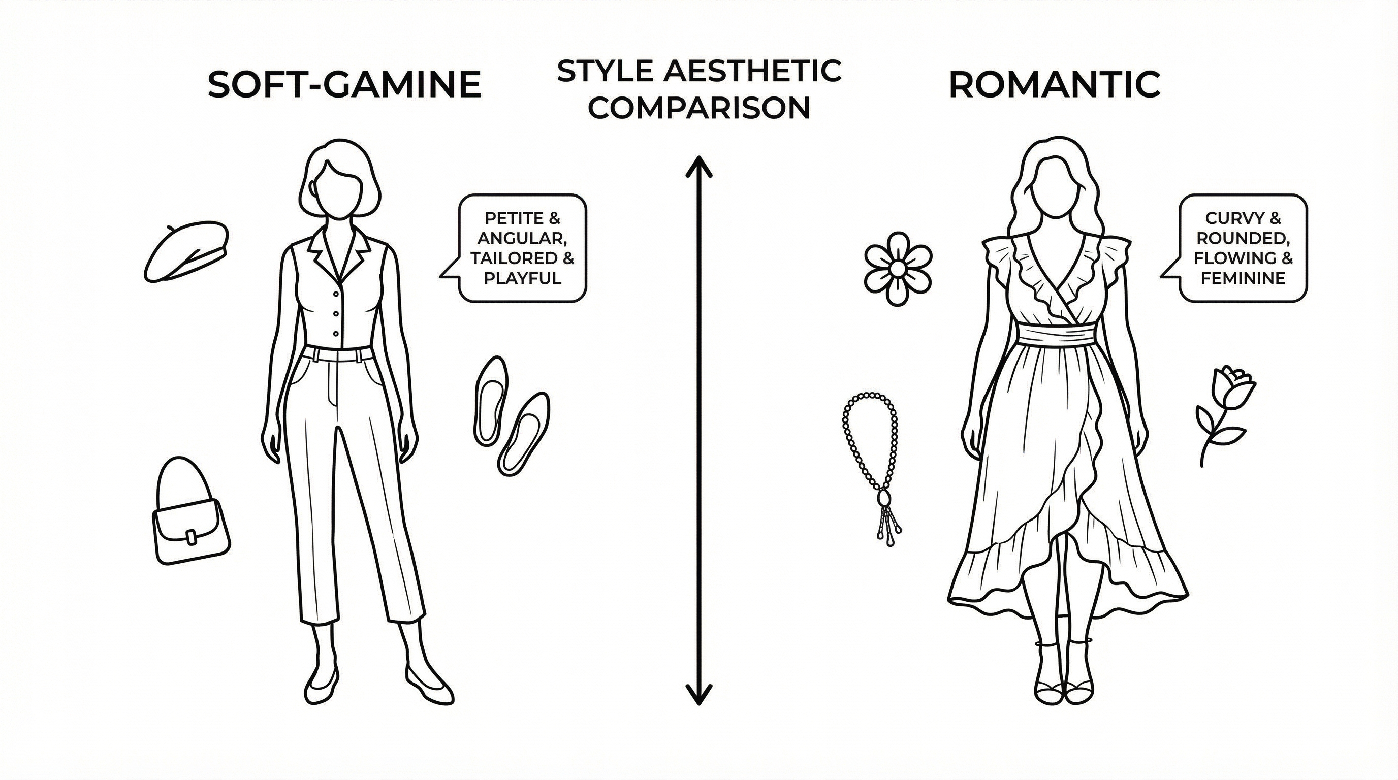 Soft Gamines need playful, youthful styling with soft touches. Think cropped lengths, small-scale pieces, fitted but with softness, and fun contrasts that honor both their yin and yang. The key is cute and youthful rather than sensual and flowing. Romantics need purely soft, draped, curve-hugging styling. Think flowing silhouettes, soft fabrics, rounded shapes, and romantic details. The key is soft sensuality without interruption—no sharp contrasts, no cropped lengths breaking up the curves.